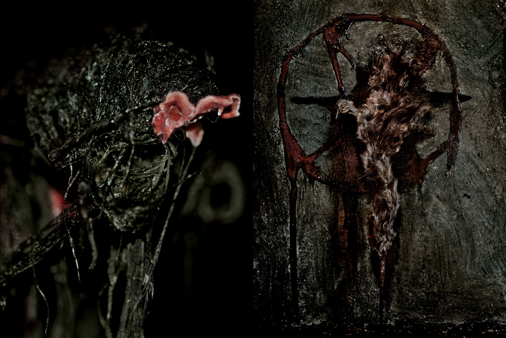 As the illustrative material makes clear, working the fauna and flora, insect and animal life into organic assemblages of living and dead matter has less to do with the production of a recognisable art; and everything in common with the fetishes and jujus that manifest the sorcerous intent of dark alchemies wherein the very being of the alchemist is transformed through a creative absorption within the organically evolving processes; and in so doing, progressively dissolves the layers of the persona allowing the emergence of an other-than- human awareness,