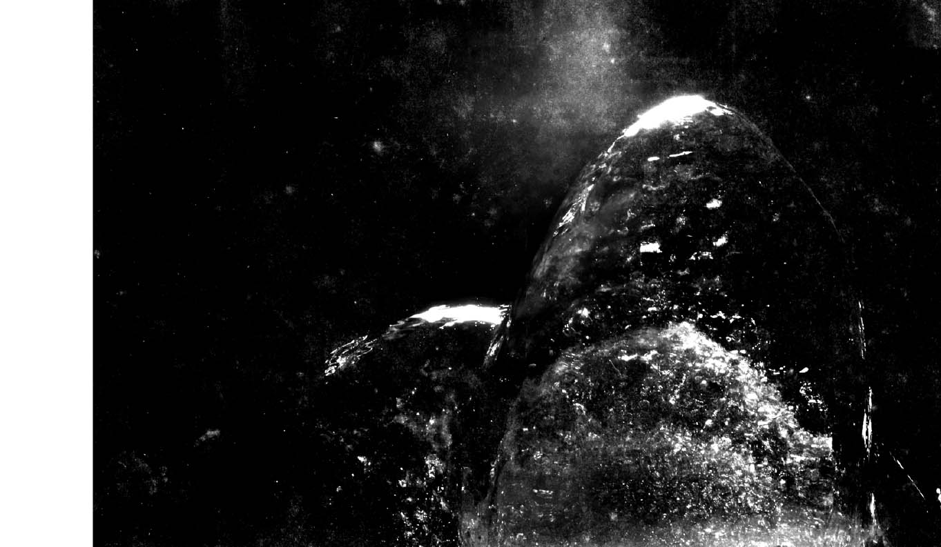 Au détour d’une cavité miraculeuse, nous découvrons dans Near Dante Experience des corps anthropomorphes pris dans la roche. Ces créatures formalisent la pensée de Pierre Teilhard de Chardin qui inscrit la Vie dans une poursuite évolutive de la Matière3. De manière spéculaire, les recherches de Cocytus Defrosted corroborent l’idée d’un corps humain constitué de poussières d’étoiles. La fusion du géologique et du biologique façonne ainsi le trans-/post- humanisme, anticipé par Dante Alighieri, formalisé par Laura Mannelli, projeté par Gast Bouschet & Nadine Hilbert. La dématérialisation à l’œuvre – virtualité ou fonte – rappelle paradoxalement que rien n’échappe à la matière : simples métamorphoses, transmutations alchimiques, décompositions de la lumière ou de l’eau omniprésents. Le monstre ou le cyborg contiennent les mêmes avancées, usent de similaires stratégies ; les corps sonores renvoient la musique à sa dimension physique ; les silhouettes dessinées à l’obsidienne traduisent les archétypes fondateurs. La matière même des peintures (noir d’os, roche volcanique), le noir obsédant et profond, les Pierres noires en lévitation, lient les monolithes des corps noirs cosmiques, de la Ka’aba et de 2001: A Space Odyssey (Stanley Kubrick, 1968), confondent par un effet réflecteur le singe à l’astronaute, le sorcier au scientifique.